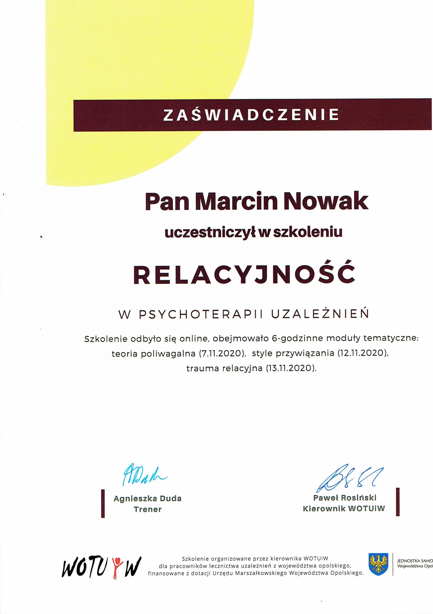 Jestem certyfikowanym specjalistą psychoterapii uzależnień, psychoterapeutą w procesie certyfikacji oraz pedagogiem. Prowadzę gabinet psychoterapii w Kędzierzynie-Koźlu, w którym – jeśli potrzebujesz – znajdziesz pomoc psychologiczną w poradzeniu sobie z życiowymi trudnościami.