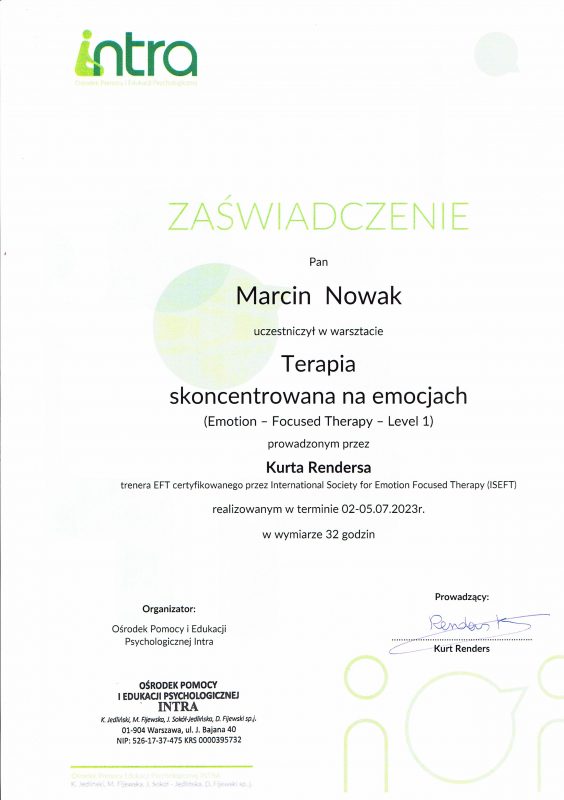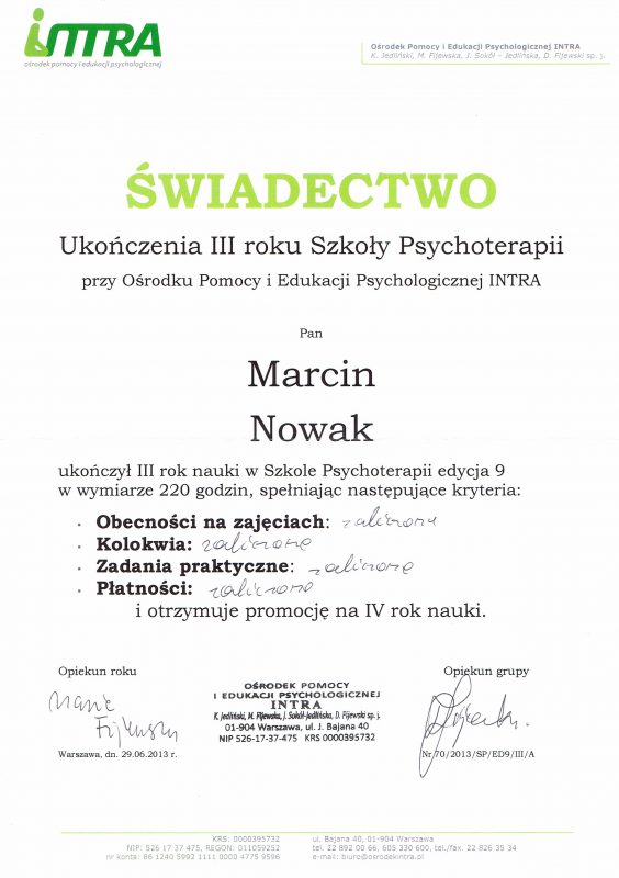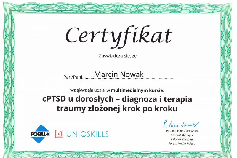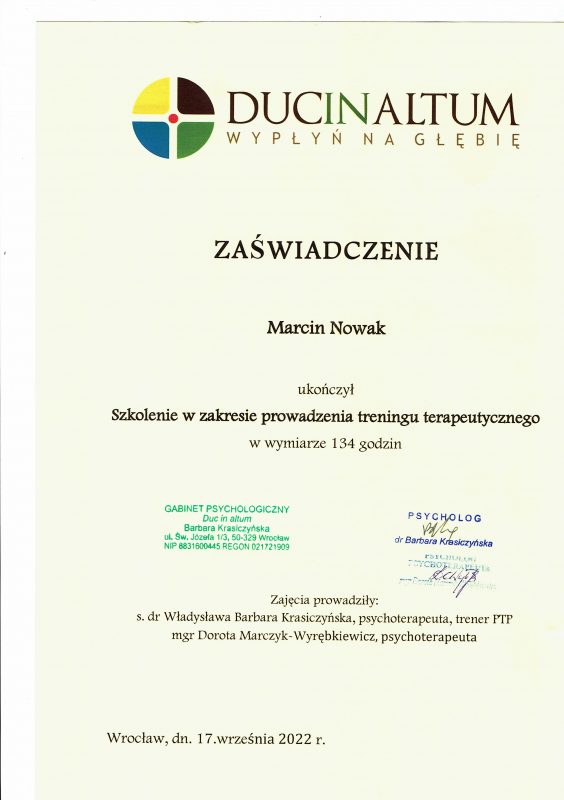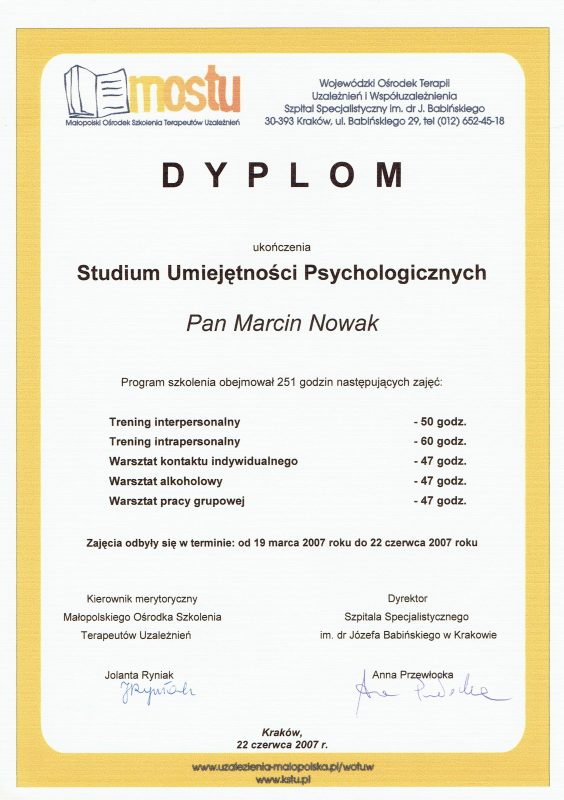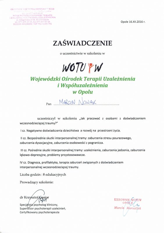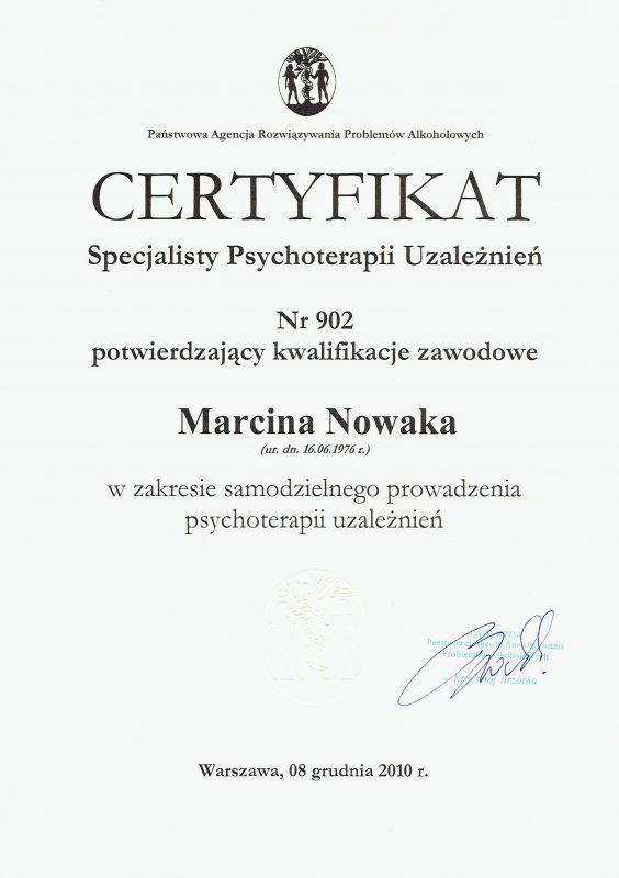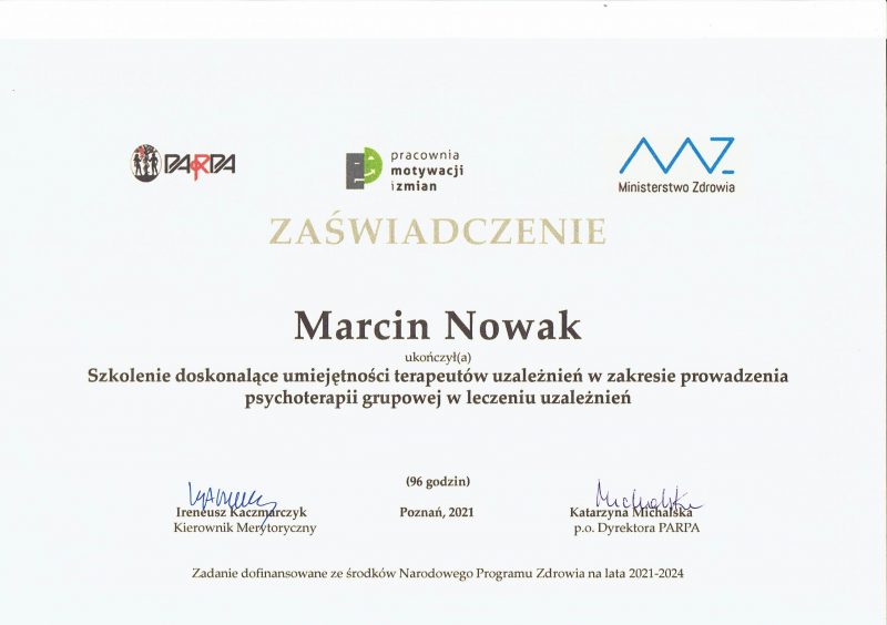 Może dziwi Cię, że oferuję pomoc psychologiczną, nie legitymując się dyplomem psychologa. Samo bycie psychologiem nie upoważnia do prowadzenia psychoterapii, jest do tego potrzebne dalsze kształcenie. Jestem psychoterapeutą w trakcie certyfikacji, certyfikowanym specjalistą psychoterapii uzależnień. Stale podnoszę swoje kompetencje prowadzenia psychoterapii, uczestnicząc w licznych kursach i szkoleniach zawodowych. Swoją pracę poddaję superwizji.