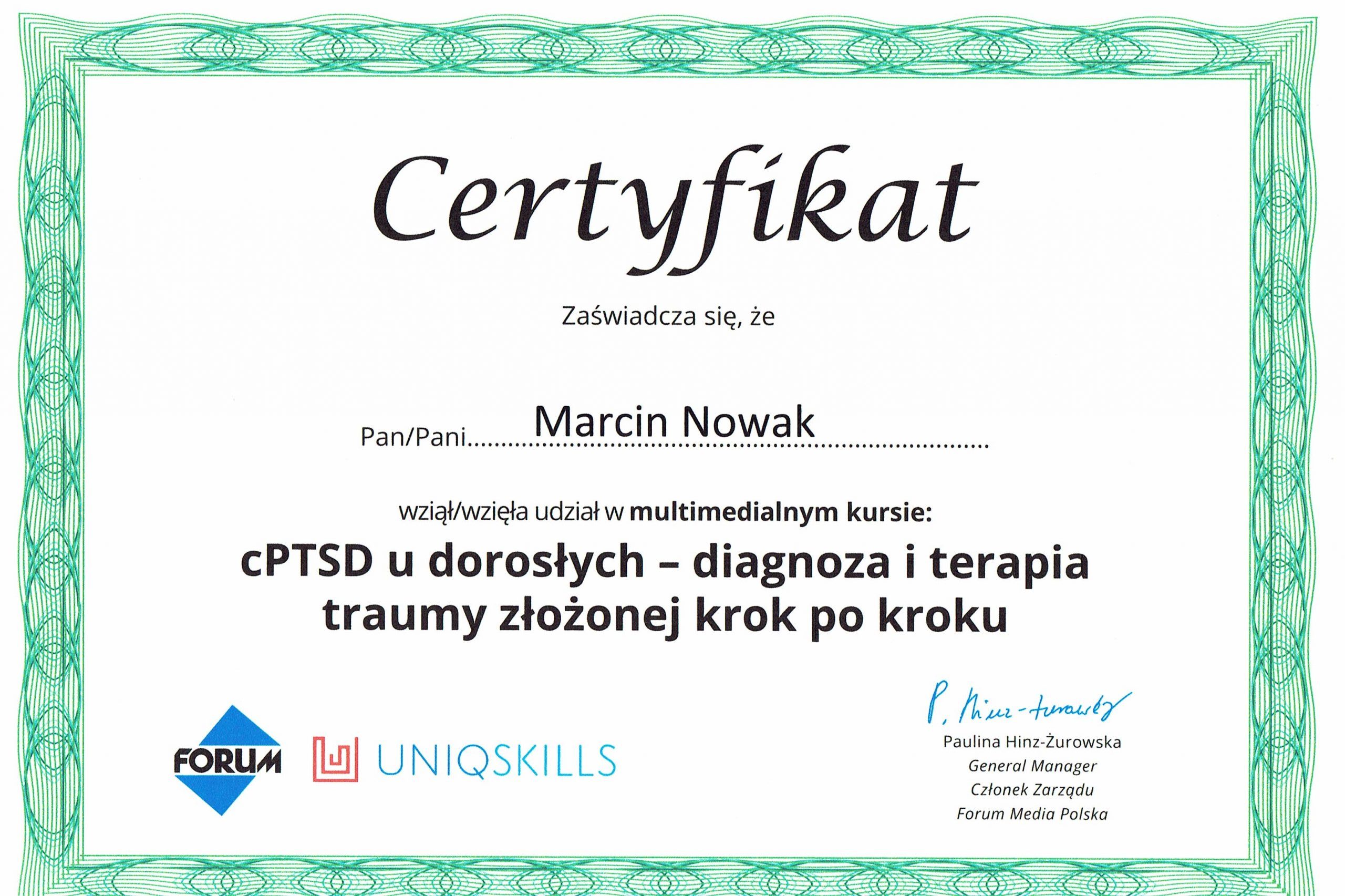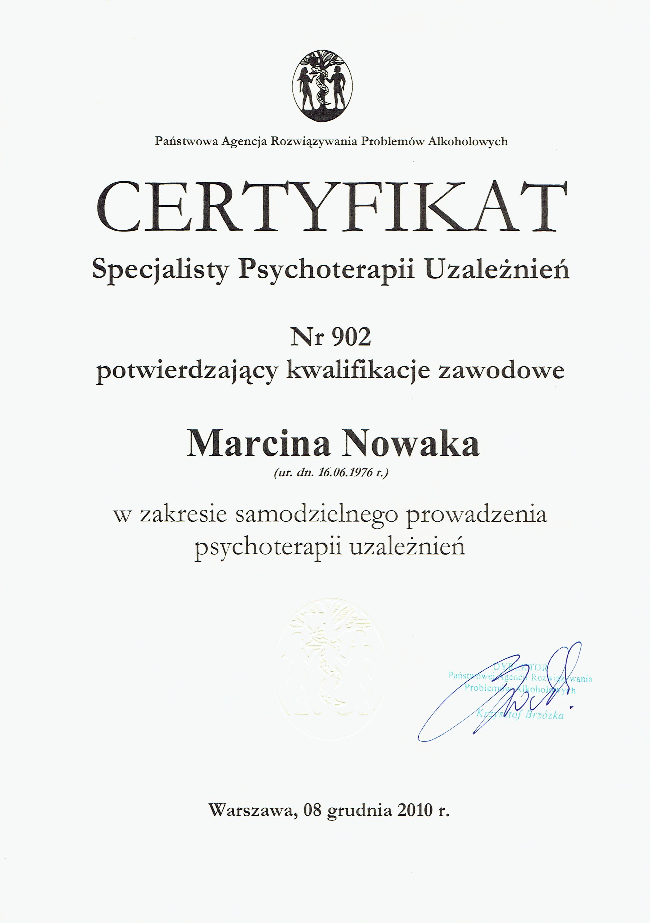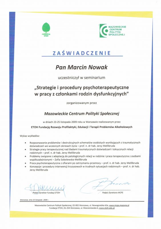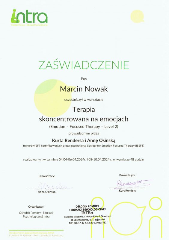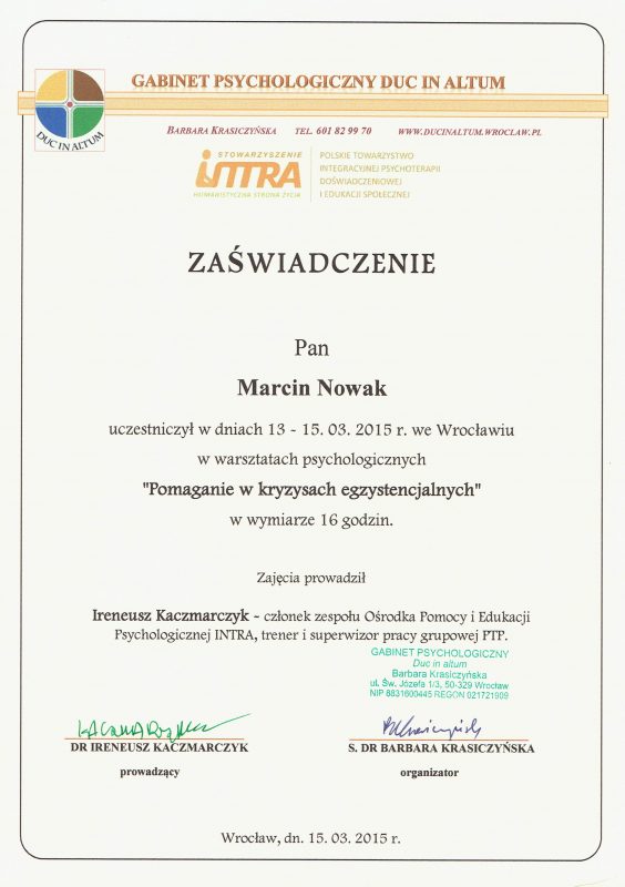 Może dziwi Cię, że oferuję pomoc psychologiczną, nie legitymując się dyplomem psychologa. Samo bycie psychologiem nie upoważnia do prowadzenia psychoterapii, jest do tego potrzebne dalsze kształcenie. Jestem psychoterapeutą w trakcie certyfikacji, certyfikowanym specjalistą psychoterapii uzależnień. Stale podnoszę swoje kompetencje prowadzenia psychoterapii, uczestnicząc w licznych kursach i szkoleniach zawodowych. Swoją pracę poddaję superwizji.